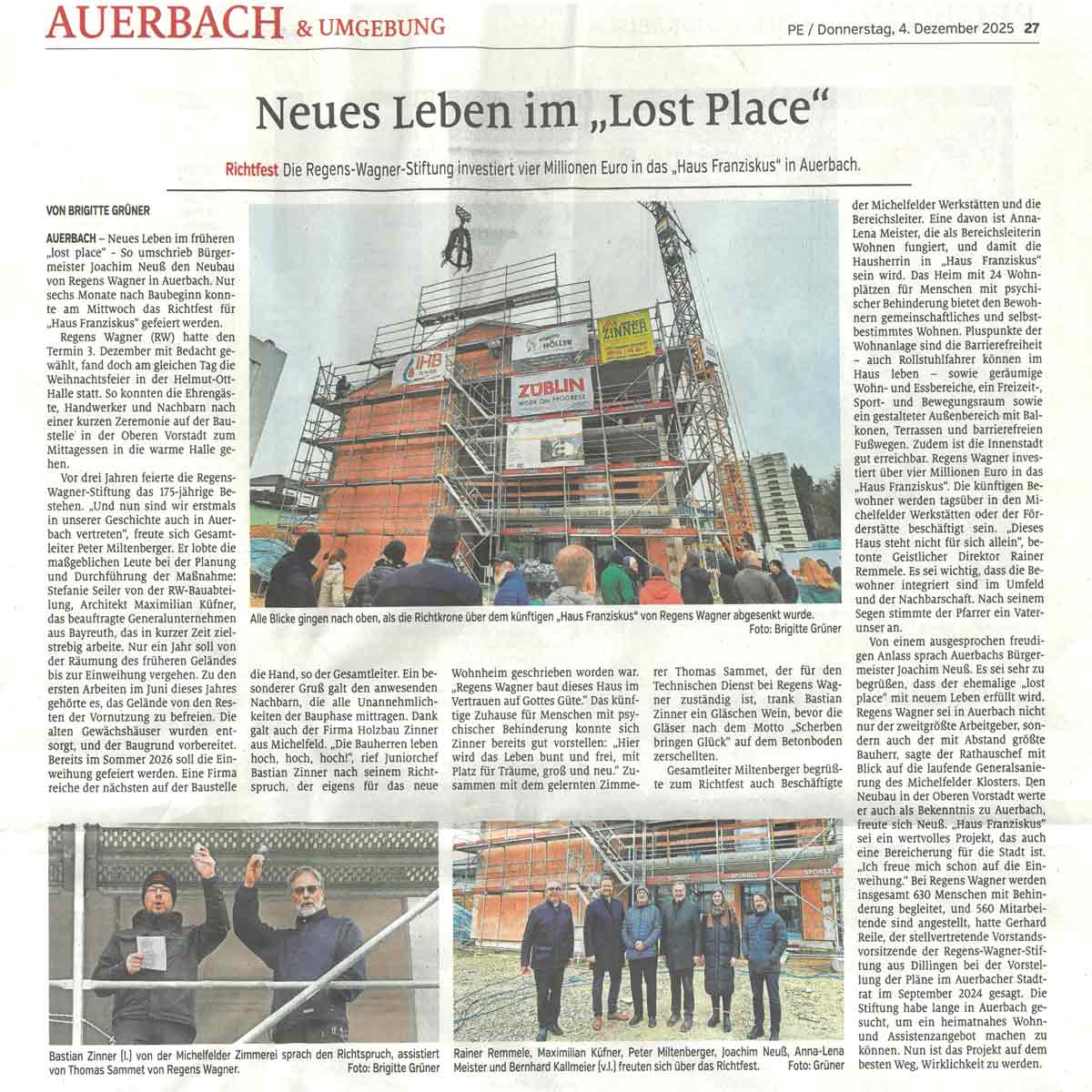 Richtfest der Regens-Wagner-Stiftungfür ihr "Haus Franziskus" in AuerbachLink zum Artikel der Nürnberger Nachrichten PrevNext